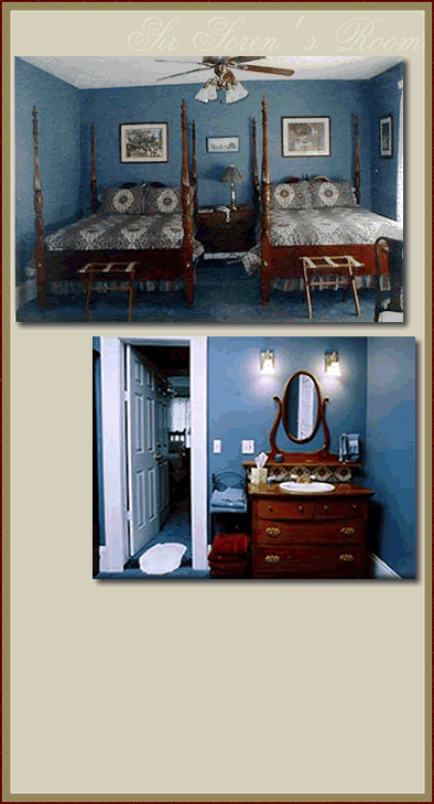 This stately room, with its blue decor, features two queen-sized